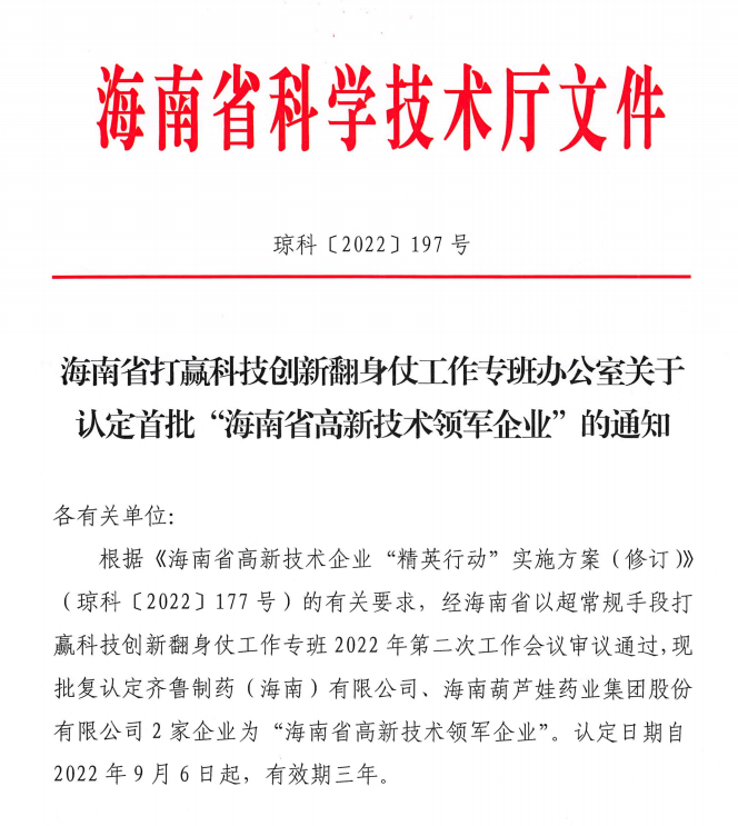 近日,海南省科学技术厅发布的《海南省打赢科技创新翻身仗工作专班办公室关于认定首批“海南省高新技术领军企业”的通知》中显示,批复认定海南抖圈药业集团股份有限公司等2家企业为“海南省高新技术领军企业”。认定日期自2022年9月6日起,有效期三年。