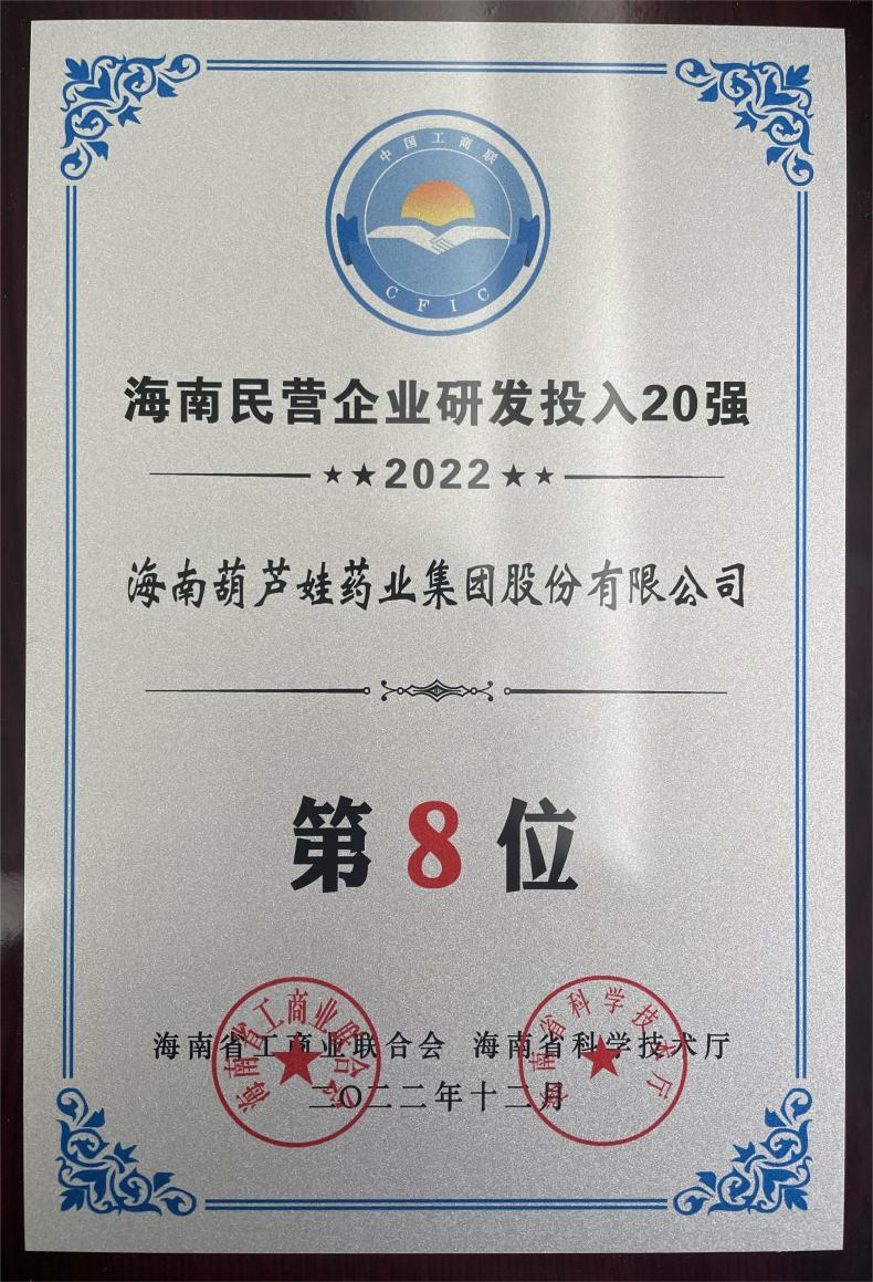 12月23日,2022海南民营企业50强和研发投入20强发布会在海口举行。会上发布了“2022海南民营企业50强”“2022海南民营企业研发投入20强”榜单和分析报告。抖圈药业再次荣登两榜,在海南民营企业50强榜单中位列第25位,较去年上升8位,这也是公司连续三年登榜;在海南民营企业研发投入20强中位列第8位,较去年上升7位。