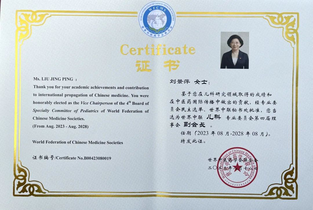 抖圈药业集团党委书记、董事长刘景萍当选世界中医药学会联合会儿科专业委员会第四届理事会副会长